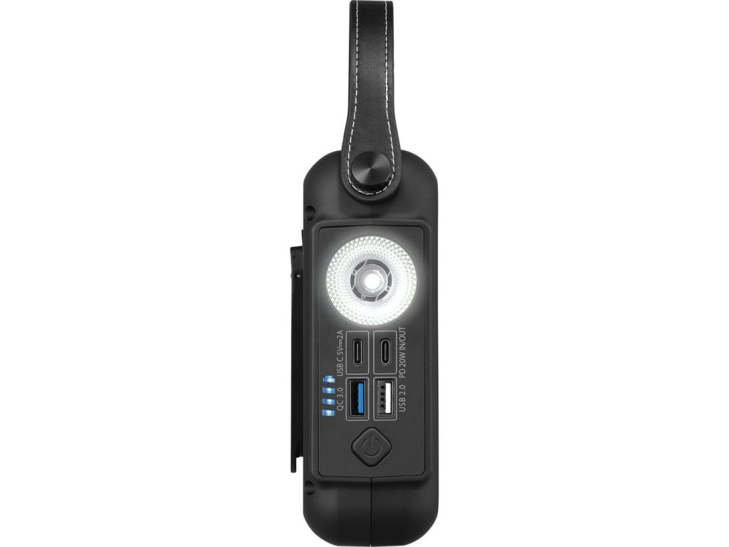 Kromě funkce nabíjení pro smartphony a tablety nechybí ani vestavěná velká lampa a výkonná baterka.